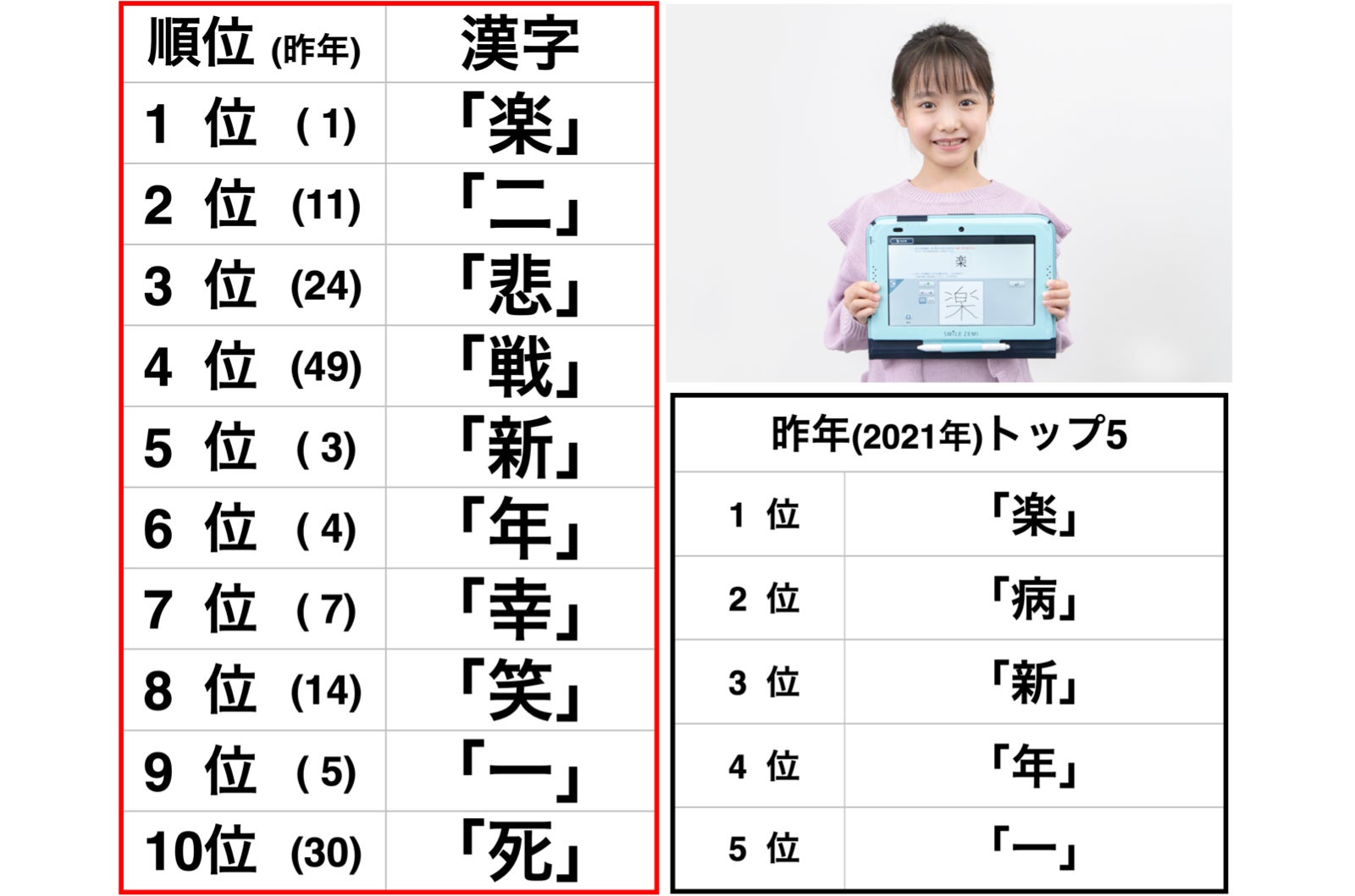 株式会社ジャストシステムのプレスリリース(2022年12月13日 00時10分)“小学生の選ぶ”「今年の漢字®」1位は、2年連続「楽」 ~トップ5は「楽」「二」